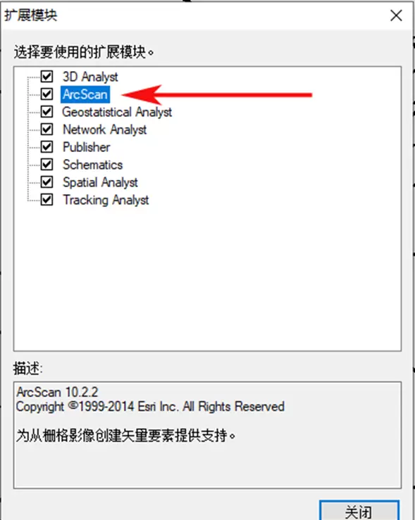 3.1 首先需激活 ArcScan 扩展模块:点击菜单栏“自定义”→“扩展模块”,在弹出窗口中勾选 ArcScan 选项。