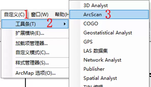 3.2 然后加载 ArcScan 工具条:仍通过“自定义”→“工具条”,在子菜单中启用 ArcScan。