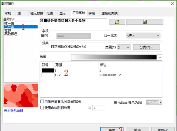 1.3 接着,在内容列表中右键点击重分类后的图像,选择“属性”→“符号系统”,进行显示优化。