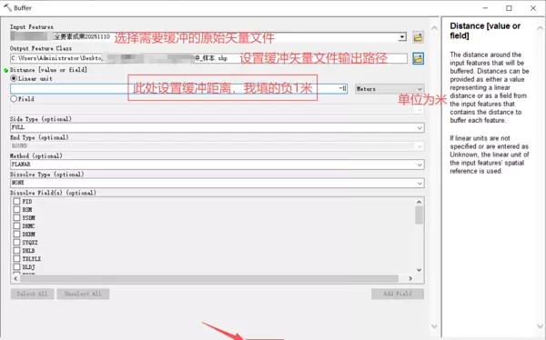 - 配置相关参数,包括选择输入要素、指定输出路径以及设定负缓冲距离;