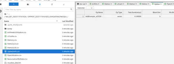 python run_test.py -i add_example_prototype.json -c add_example_cases.json --op-type "custom" --op-path "/home/ma-user/Ascend/ascend-toolkit/latest/opp/vendors/custom_math/op_api" --msprof --op --sim -d ./msprof