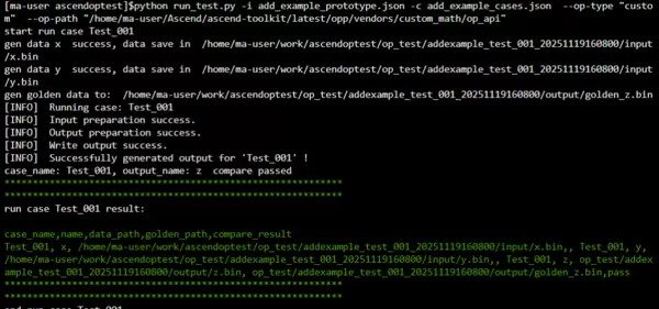 python run_test.py -i add_example_prototype.json -c add_example_cases.json --op-type "custom" --op-path "/home/ma-user/Ascend/ascend-toolkit/latest/opp/vendors/custom_math/op_api"