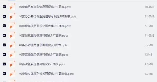 该系列包含5套不同色彩风格的模板,分别为蓝绿配色(13.00 MB)、橙绿信息图表集(5.32 MB)、浅色系(4.59 MB)、暗色系多彩(10.38 MB)以及多彩通用版(9.66 MB),每套均含40个图表。
