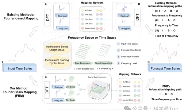为解决上述问题,本文提出傅里叶基映射(FBM),通过引入傅里叶基函数展开与时空映射机制,融合时域与频域特征,实现对频率成分的清晰解释并保留时间结构特性。该方法具备“即插即用”能力,仅需替换或调整神经网络的初始投影层即可集成至多种架构,显著提升预测性能。