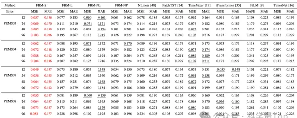 评估指标采用 MSE 和 MAE,测试 FBM 的多个变体(FBM-L、FBM-NL、FBM-NP)以及整体框架 FBM-S 的表现。实验结果显示: