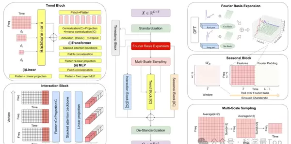 图4展示的是本文提出的完整预测框架 FBM-S,由三个功能模块组成,分别处理趋势、季节性及交互效应,并采用 ID(独立通道)与 DC(依赖通道)建模相结合的方式,兼顾局部与全局特征关联。