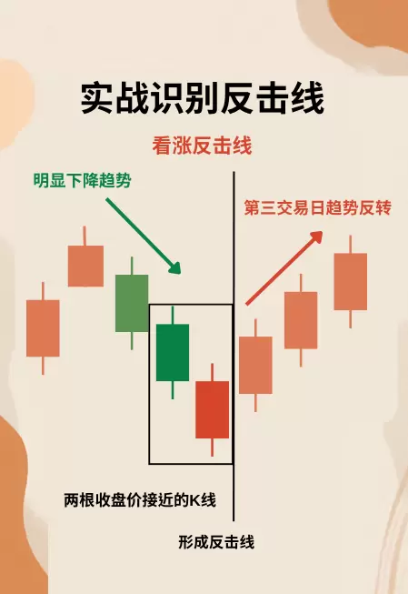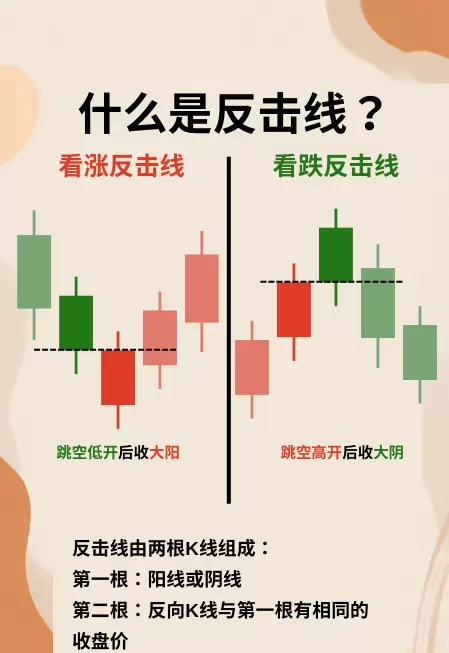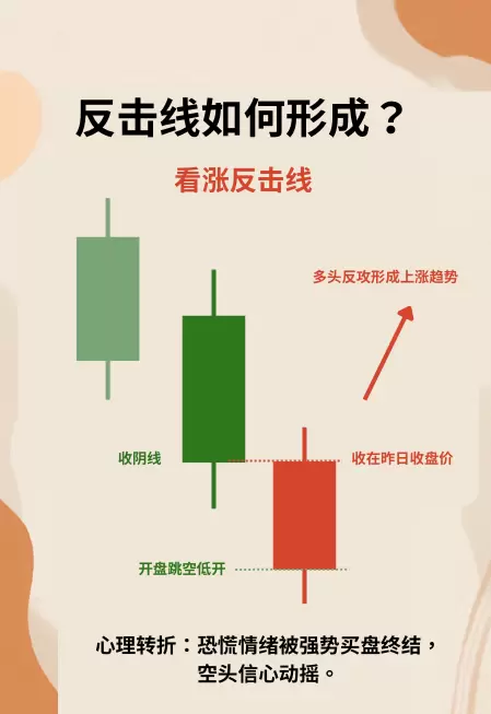 - 看涨反击线:出现在持续下跌之后,首日收出大阴线,次日跳空低开后强势拉升,最终以大阳线收盘,价格回升至前一日开盘附近;
