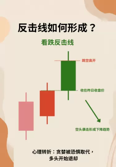 - 看跌反击线:发生在显著上涨行情后,首日为大阳线,次日跳空高开却遭遇打压,最终收出大阴线,价格回落至前一日开盘水平。