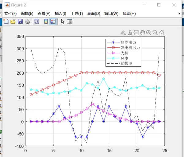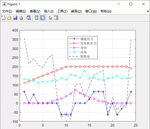 首先,程序从Excel文件中读取典型日数据,获取风电与光伏的出力曲线、原始负荷曲线以及分时电价信息。在此基础上设定微电网各组件的技术参数:储能系统容量为300kWh(充放电功率限值按容量的21%计算),风电装机容量200kW,光伏装机容量100kW,燃气轮机额定容量200kW(最小技术出力10kW),联络线最大传输功率为500kW。