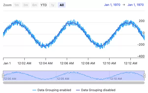 在使用数据分组功能时,图表的整体渲染性能显著提升。其核心原因在于:当需要展示的数据点数量非常庞大时,过多的点不仅无法有效提升图表的可读性,反而会加重渲染负担。通过数据分组,实际参与渲染的点数被大幅减少,从而优化了显示效率。