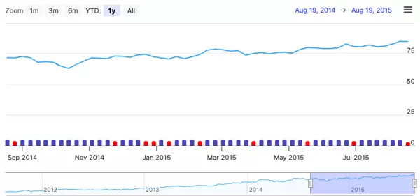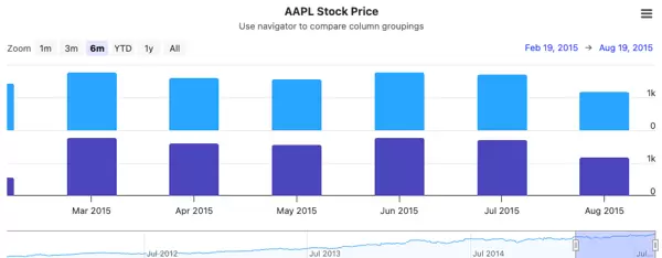 Highcharts Stock 的数据分组以水平轴(x轴)上的像素宽度为基础进行划分。每一个分组大致对应 x 轴上指定数量的像素。不同类型的系列具有不同的默认像素宽度,因为例如折线图比柱状图更能容纳密集的数据点。