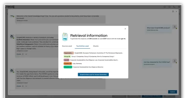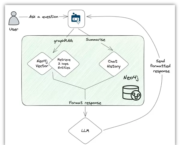 当用户提交问题时,系统首先调用Neo4j的向量索引和检索机制,查找与问题最相关的文本块,并沿图谱扩展最多两跳范围内的关联实体。同时,系统还能汇总当前聊天历史,将其作为上下文的一部分加以利用,以增强回答准确性。