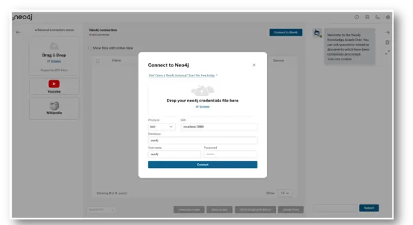 当数据库成功运行并获取凭证后,点击控制台右上角的“Connect to Neo4j”按钮,即可跳转至大模型知识图谱构建器界面。