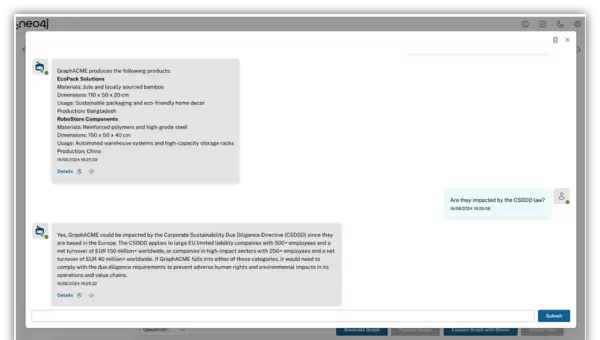 现在可以针对已上传文档的内容发起查询。例如,可以询问某公司生产的产品列表,进一步了解这些产品是否受到CSDDD法规的影响,以及具体产生哪些合规层面的变化。