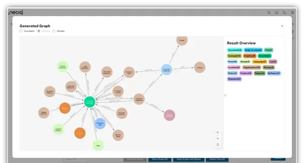 在发起基于RAG代理的提问前,用户可以选择一个或多个文档,然后点击“显示图谱(Show Graph)”按钮。系统将展示所选文档中包含的实体;此外,也可在此视图中查看文档节点和文本块节点。