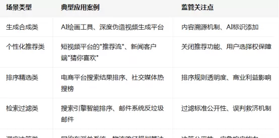 - 属于重点监管的五类应用场景:包括个性化推荐、检索排序、调度决策、生成合成、排序精选等类型(具体分类见下表)。