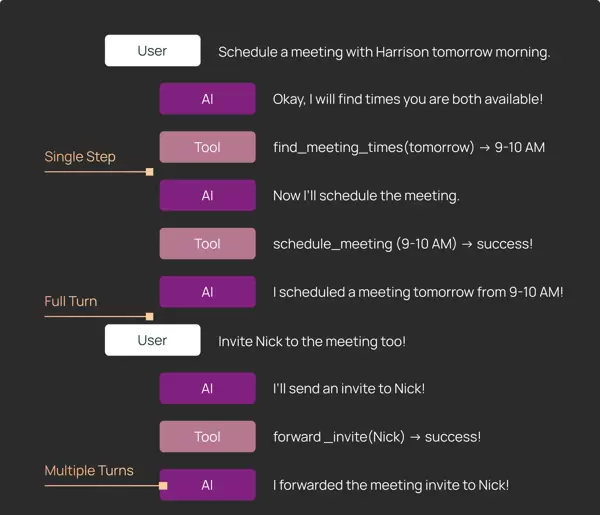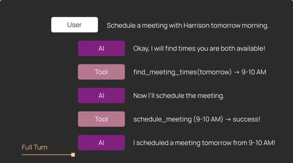 - 完整轮次 (Full turn):让 agent 完整处理一次输入请求,期间可能触发多次工具调用