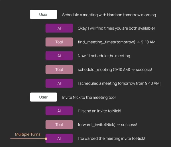 - 多轮对话 (Multiple turns):模拟连续交互过程,agent 可进行多轮响应与状态更新