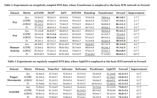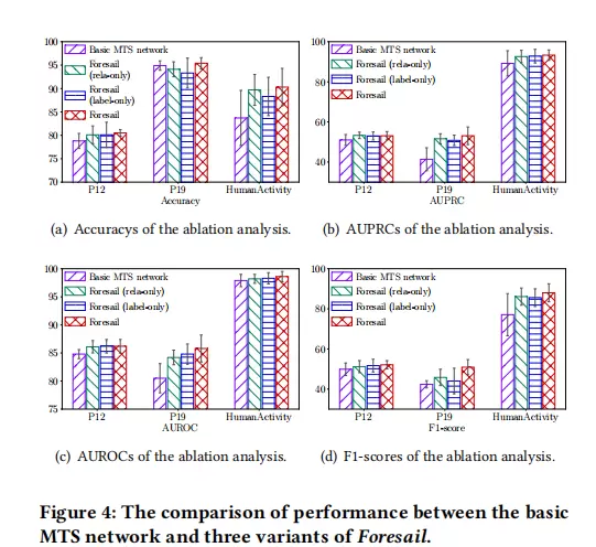 为全面验证Foresail的有效性,实验选取了五个公开数据集进行测试,包括P12、P19和HumanActivity(不规则采样),以及FingerMovements和NATOPS(规则采样)。评价指标涵盖准确率(Acc)、精确率-召回率曲线下面积(AUPRC)、ROC曲线下面积(AUROC)以及F1分数。