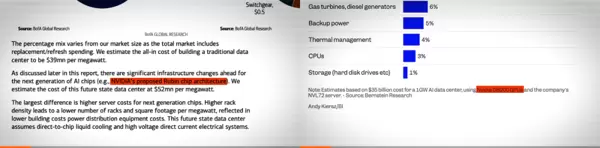 - Bernstein(11月1日报告):每GW成本约为350亿美元。其中GPU、网络、CPU、存储等IT相关支出合计占56%,明显低于美国银行所估的84%。