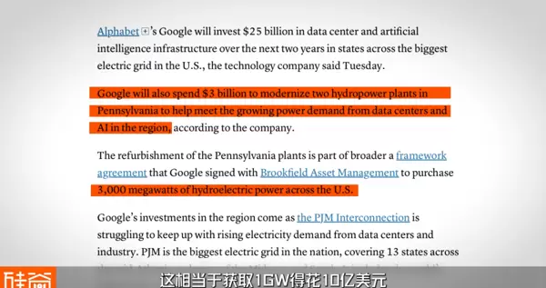 谷歌曾投入30亿美元改造宾夕法尼亚州的两座水电站,旨在获取总计3000MW的稳定电力资源——相当于每获得1GW电力需花费约10亿美元,而这仅是改造费用。此外,马斯克也为推进Colossus2项目,收购了一家现成的发电厂。