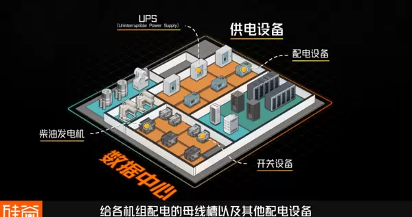 作为数据中心的能源中枢,供电系统的稳定性直接决定整体可用性。其主要组成部分包括:应急供电用的柴油发电机、配电控制开关设备、保障不间断运行的UPS(不间断电源系统),以及为机柜供电的母线槽和其他配电装置。