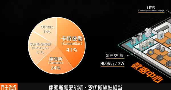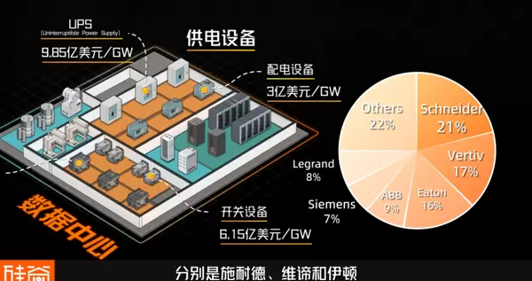 除了发电设备外,1GW数据中心还需投入约6.15亿美元用于开关设备,9.85亿美元用于UPS(不间断电源)系统,以及3亿美元用于配电装置。这些电气基础设施的主要提供商为施耐德、维谛和伊顿。