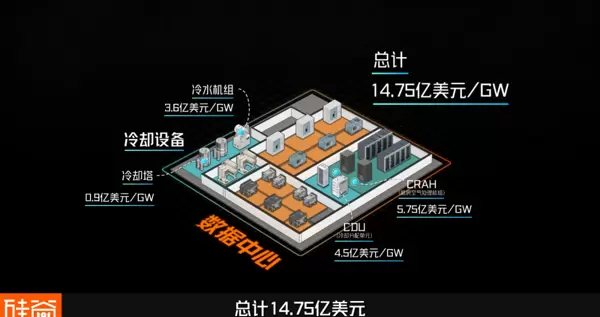 配备液冷的数据中心,其冷却系统主要包括冷却塔、冷水机组、CDU(冷却分配单元)及CRAH(机房空气处理机组)。为支持1GW的散热负荷,各部分所需投入分别为0.9亿、3.6亿、4.5亿和5.75亿美元,合计达14.75亿美元。