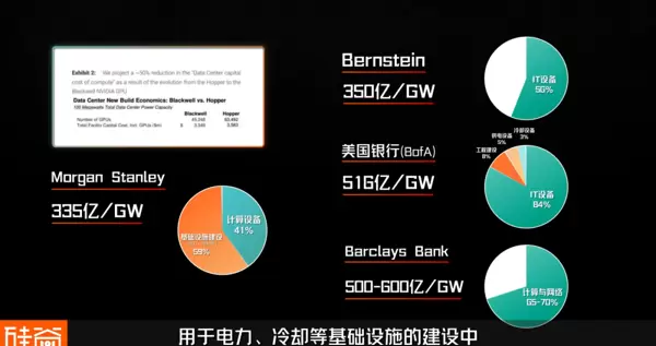 - Morgan Stanley(8月研究模型):每GW成本为335亿美元,计算设备占比41%,其余59%分配给电力、冷却等基础设施。