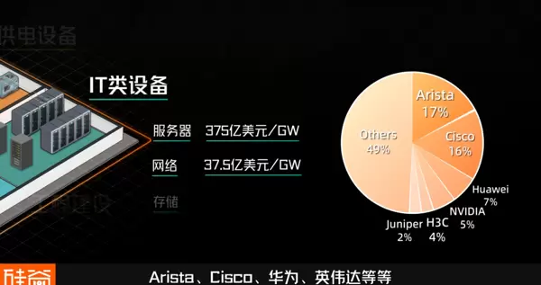 IT设备是数据中心最核心的成本构成,主要包括服务器、网络设备与存储系统三大部分,其中服务器占据绝对主导地位,每GW算力所需投入高达375亿美元。