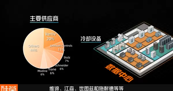 该产业链涉及多个细分环节,供应商分布广泛。其中较为突出的企业包括维谛(Vertiv)、江森自控(Johnson Controls)、世图兹(Stulz)以及施耐德电气(Schneider Electric)等。