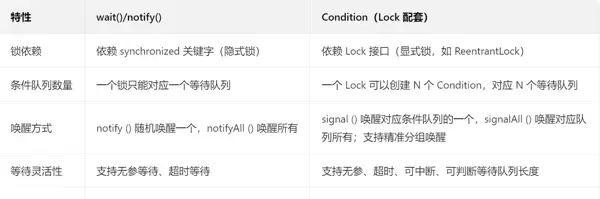 | 等待队列数量 | 每对象仅一个等待队列 | 一个 Lock 可创建多个 Condition,对应多个等待队列 |