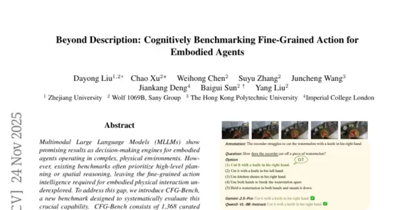 在具身智能(Embodied AI)的发展进程中,一个核心难题始终存在:如何使机器真正理解物理世界中动态交互的本质。尽管当前多模态大模型(MLLMs)在内容识别方面取得了显著突破,能够准确为视频片段打上诸如“一个人正在切西瓜”之类的标签,但这种能力本质上仍停留在分类或描述层面。它解决了“是什么”的问题,却难以触及更深层次的认知维度。 人类在观察动作时的认知过程远比简单的识别复杂得多。我们不仅能识别出“切西瓜”这一行为,还能迅速解析出手法细节——比如左手如何固定瓜体、右手如何控制刀具;理解背后的因果逻辑——为何要先稳定物体再下刀以防止滑动;推断潜在意图——是准备即食还是进行艺术雕刻;甚至能对动作质量做出判断——切割是否精准、安全和高效。这种涵盖“如何做”、“为何做”以及“做得好不好”的精细化认知体系,正是当前人工智能与人类智能之间存在的巨大差距。 这一认知鸿沟直接导致了机器人在现实世界中表现出“眼高手低”的现象。虽然AI在虚拟环境中可以生成流畅的文本或图像,但在驱动机械臂完成精细操作时往往表现不佳。这背后反映的是人工智能领域一个经典悖论——莫拉维克悖论(Moravec's Paradox):对人类而言轻而易举的感知与运动技能,对AI来说却异常困难;而需要高度抽象思维的任务(如下棋),AI反而能轻易超越人类。 为系统性攻克这一根本挑战,浙江大学刘大勇教授团队联合三一重工、香港理工大学及伦敦帝国理工学院等机构,共同提出了一套全新的评测基准——CFG-Bench。该基准不仅是一个数据集,更是一种完整的动作理解评测与训练范式。其目标在于推动AI从表层的动作识别迈向深度的动作理解,为构建能在物理世界中高效、安全执行任务的智能体提供一把精确的“标尺”和一本实用的“教科书”。一、具身智能的认知瓶颈:跨越“识别”到“理解”的鸿沟