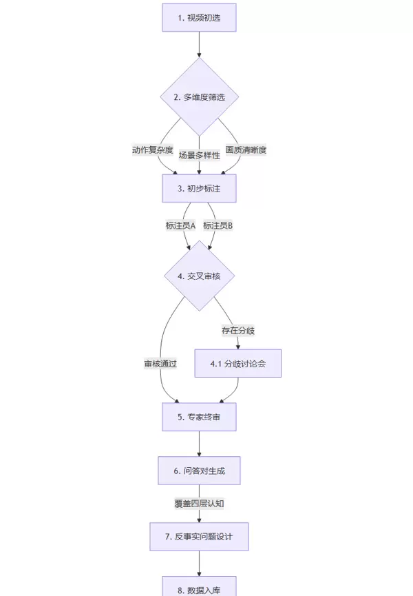 交叉审核机制:每个视频由至少两名标注员独立完成标注与问题设计。若两者输出存在分歧,则进入仲裁环节,由资深专家进行裁决,从而确保最终结果的客观性与一致性。