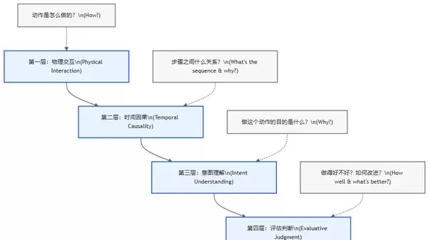 CFG-Bench 最具突破性的贡献在于提出了一套模拟人类认知过程的四层递进式评测框架。这四个层次由具体感知逐步上升至抽象推理,系统覆盖动作理解的全部维度。