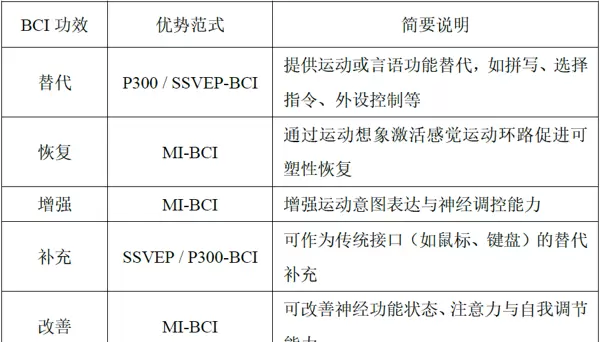 BCI 可用于替代、恢复、增强、补充或改善中枢神经系统(CNS)的自然输出功能[6],涵盖上述五类应用场景。目前研究最为广泛的三种经典 BCI 范式——运动想象(MI)、稳态视觉诱发电位(SSVEP)和 P300 范式,在这五类功能目标中的表现各有侧重,参见表2。其中,MI-BCI 在功能恢复、增强与改善方面更具潜力;而 P300 与 SSVEP 类型的 BCI 则在功能替代与补充上表现出更强适应性。