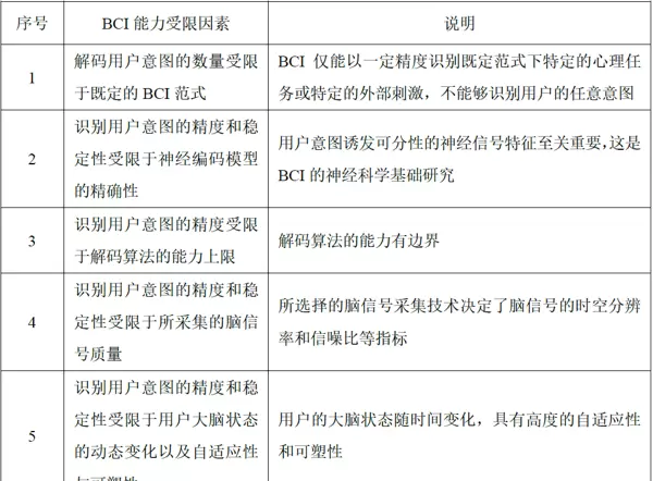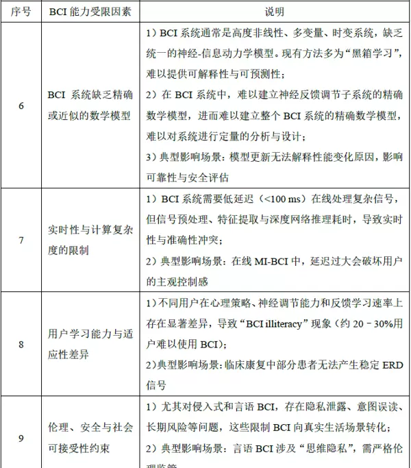 表1总结了影响 BCI 能力的具体限制因素及其说明。