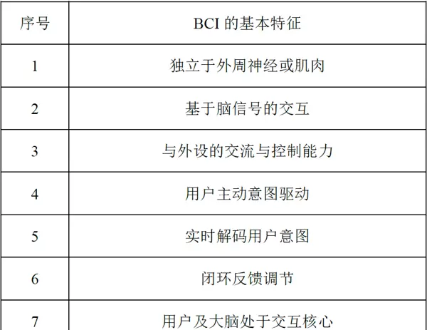 除必要组件外,BCI还具有一系列区别于其他脑相关技术的本质属性。同样基于Wolpaw等人(2012)[6]与伏云发等人(2024)[13]的研究成果,表5归纳了BCI的七个基本特征,包括:不依赖外周神经或肌肉通路、以脑信号为基础实现交互、具备对外部设备的控制与通信能力等。这些特征共同界定了BCI的核心行为表现。