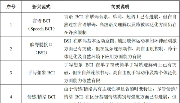 近年来,除了传统的三类经典脑机接口(BCI)范式之外,还涌现出一系列新兴的BCI模式,例如言语BCI[24]、脑–脊髓接口[21]、手写想象BCI[25]以及情感或情绪识别BCI[26]等。然而,这些新方向目前仍处于初步探索阶段,大多局限于基础研究层面,距离实际应用仍有较大差距,其功能也受到多方面限制。以下表格汇总了部分代表性新兴BCI范式及其简要说明。