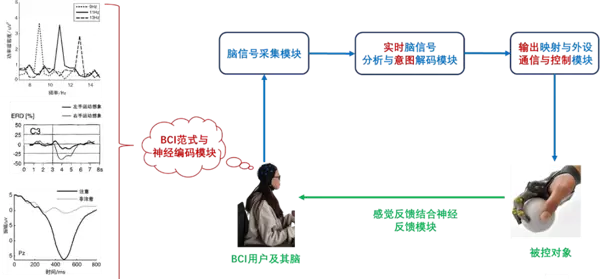 BCI 是一类以用户及其大脑为核心单元,不依赖外周神经或肌肉参与,通过采集脑信号,在特定实验范式下进行神经信息编码,经实时意图解码后将其映射为通信内容或对外部设备的控制指令,并结合感觉反馈或神经反馈机制形成闭环的人机交互系统,如图1所示。