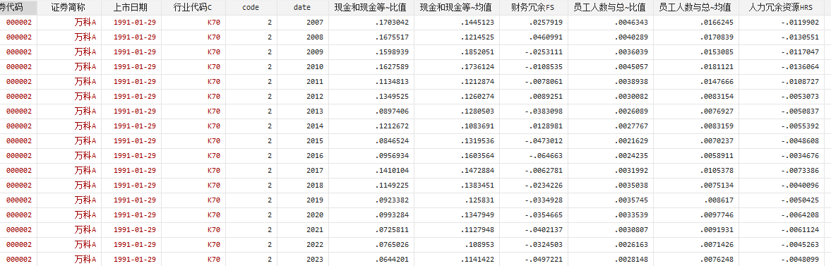 2023-2007年A股上市公司财务与人力资源冗余数据及Stata代码