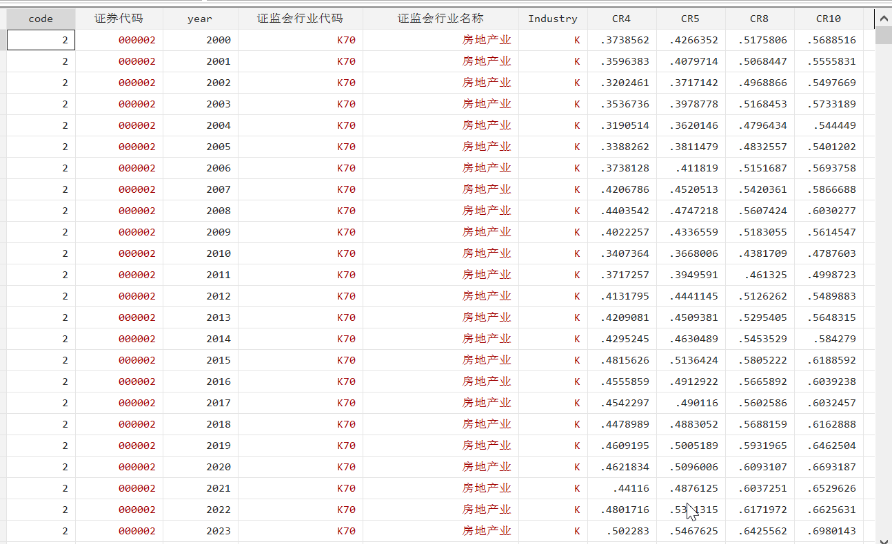 2000 - 2023年送do处理代码的A股产品市场集中度竞争力数据,涵盖CR4、CR5、CR8、CR10