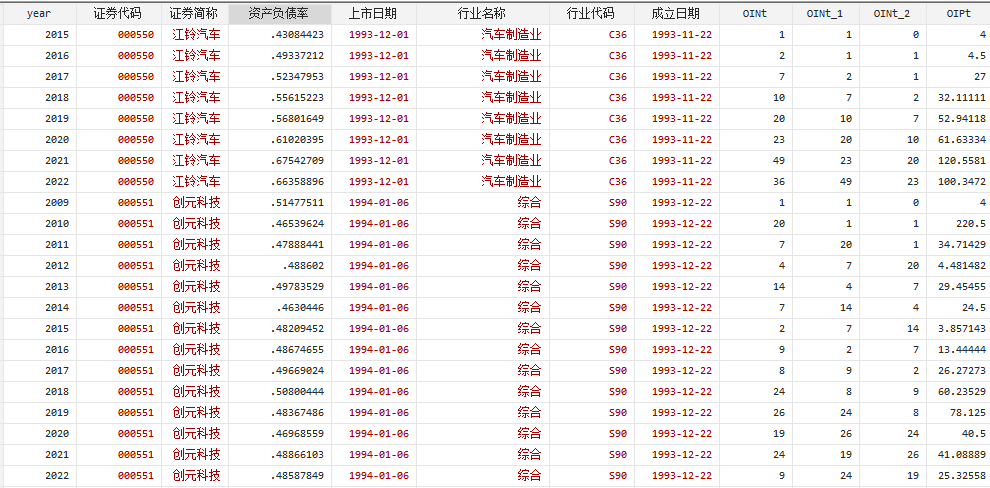 | 涵盖指标 | 股票代码、证券简称、年份、行业名称、行业代码、资产负债率、总资产、总负债、绿色专利总共申请总量、去年绿色专利总共申请总量、前年绿色专利总共申请总量、企业持续绿色创新水平 |