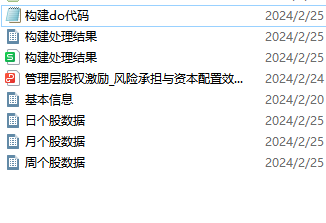 相关图片5附件文件内容本附件包括:构建do代码.do、构建处理结果.dta、构建处理结果.xlsx、管理层股权激励_风险承担与资本配置效率_苏坤.pdf、基本信息.dta、日个股数据.dta、月个股数据.dta、周个股数据.dta