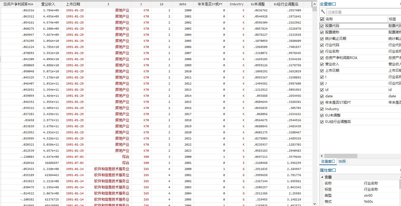 EU为衡量环境不确定性的指标。环境不确定性根源在于外部环境,外部环境变化会引起企业核心业务活动波动,最终导致企业销售收入波动,所以环境不确定性可用公司业绩波动衡量。销售收入标准差常被视为衡量环境不确定性的指标,为剔除行业影响,运用过去5年经行业调整后的销售收入标准差来衡量公司环境不确定性。不过,过去5年销售收入变化有一部分是公司稳定成长带来的。