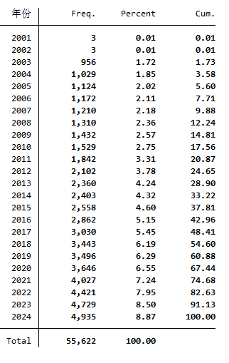 数据涵盖2001 - 2024年A股上市公司决策权配置指标数据,同时提供stata代码。