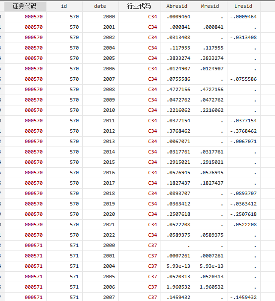 A股公司劳动投资效率数据:Net_Hire模型与do代码(2000 - 2022年)方法模型的残差作为劳动投资效率(Abresid)的测度指标。当实际人员变动率超过模型估计的预期人员变动率时,判定为冗余雇佣(Mresid);若实际人员变动率低于模型估计的预期人员变动率,则判定为雇佣不足(Lresid)。这两种情况均属于劳动投资无效率。