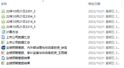 - 文件:计算方法.do、上市公司数据汇总.dta、上市公司数据汇总.xlsx、业绩预期差距、内外部治理与非效率投资_徐佳.caj、业绩预期差距、审计监督与非效率投资_王丽娟.pdf、业绩预期差距结果.dta、业绩预期差距结果.xlsx