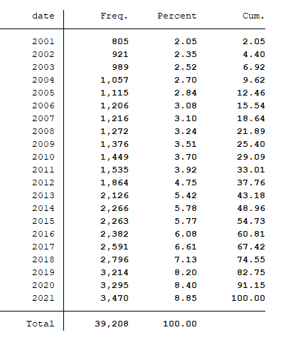 数据处理说明- 数据区间选择:全部A股2000 - 2021年,剔除金融保险行业、剔除ST、*ST公司的样本、剔除数据缺失的样本。
