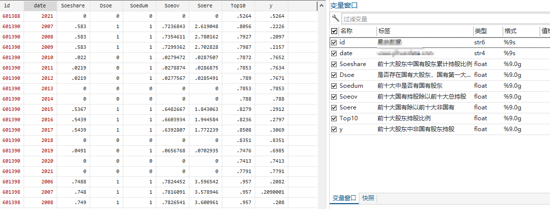 - 指标三:虚拟变量,前十大股东中是否有国有股东,如有取值为1,否则为0。(共5个指标,详见以下文献)